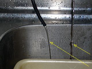 「箱の注意書き」に、“ホースから、わずかに水が出る事があります!”と書いてあるけれども、「清水」を流してみると、ホースから、「わずか」どころではない水が流れます。(左写真の左側)