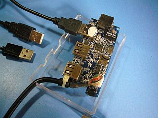 昨年11月頃に買ってそのまま放ってあった、裸で無銘の「USB&LAN-HUB モジュール」(¥100税込み 図2<クリック>)を調べて、動作OKだったので、「トランプ入れケース(プラスチック箱)」に入れた。(図1)