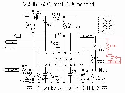 探し回って、やっとC型5KΩ(\100税込)を見付け、試してみたのですが、値不足のためか電圧範囲の狭さや動作の不安定さがあって、満足出来ませぬ。また、B型を使った“擬似C型”も上手く行かず。(更に、C型探しの旅は続く...か?)
