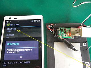 後日、USB出力型DC−DCコンバータ基板(3V→5V)(総費用¥340送料込み+¥242送料込み)を買い足し、これを経由して、スマホを充電出来るようにした。