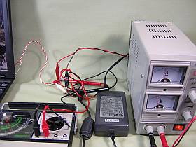 手持ちの安定化電源の最大出力電圧が15Vなので、上げ底にするため12V,3.3AのACアダプタを直列接続で援用。