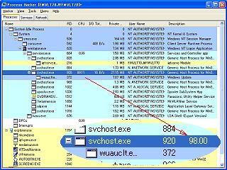 予め用意しておいた「Process Hacker」を使わせて貰って状況を見ると、確かに「svchost.exe」の処で、98%_100%近く_の値が出ている。_左図_