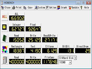 ところで、これの性能を見ようと、HDBENCHを走らせてみたら、何かとんでもないALL値が出た。166Kだって!?...通常なら、16K位であっても可笑しくは無いのだが。_左図_