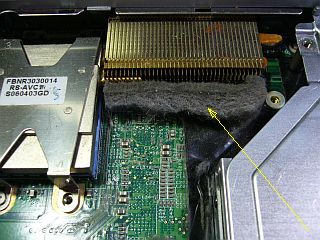 慌てて、キーボード下のCPU冷却ファンを外してみると、ファンの「吹き出し口」に何やらクッション材と見紛うばかりの物凄い綿埃♪_左写真_