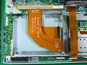 全体を眺めると、中央に後ろにCPU部、PCカード・スロット側に金属カバーを被った電源部があります。_左上写真<クリック>_