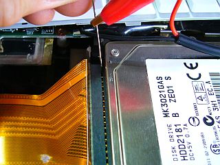 HDDのモータが回っていないのは、電源が低下しているのだろう!と思って、待ち針を介して、端子の電圧を確かめた。_左写真_