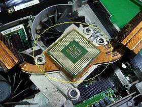 くっ付いたCPUは、細刃のドライバを叩き込んで、割るようにして外しました。_左写真<クリック>_