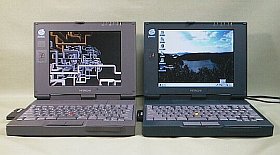 グレーのと比べて見ると、あれは液晶パネルがDSTNですが、この深緑色のはTFTなので表示の質がまったく違います。でも、その違いで惹かれたわけではありません。やはり_趣味の悪い?)本体の色だったのです。_実は、黄色のポッチもなかなか好もしい悪趣味度!とか言ったりして_