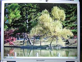 左写真は、Win98でセットした壁紙。表示は、思っていた以上に明るかった。でも、真っ白画面では、所々に虫が這ったような黒筋や淡い白筋が見えます。_経年変化かな?_