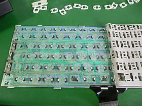水洗では効果が無かったので、改めて分解を始めたのですが、“キートップ外し”は楽だ〜♪_左写真<クリック>。でも、後が怖かった!_