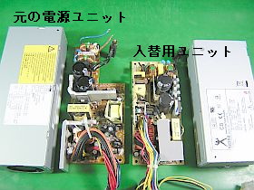 専用電源単品での手当ても考えたけど、それ程の価値は無いと判断し、内部ユニットのサイズがほぼ同じものと、中身だけ入れ替え、同時に、電源コード群も入れ替えました。そしたら、見事に動作開始!w(^^;