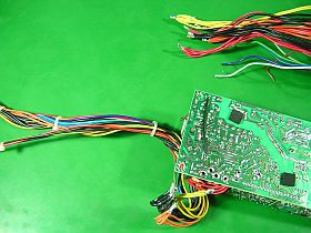 電流の少ない線やセンス線などは、挿し間違いを減らす意味もあって、“切り接ぎ方式”にしました。これだと、色が同じ線同士を繋げば間違えなくていい。_左写真<クリック>_