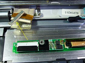 よく調べると、LED表示部へのフラットケーブル端部のスペーサが取れてしまっています。それで厚みが足りず、ちゃんとコネクタに留められない状態。