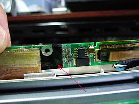 再々度の電源投入で、見事にLCD部に表示が出ました!_やった♪左上写真<クリック>。矢印は、絶縁シートの位置_