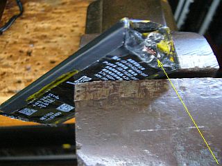 バイス(万力)ではどうか?と、ゆっくり膨らみを押し潰していたら、バスッ!という音と共に、バッテリの尻端が弾けた!!!(図3)