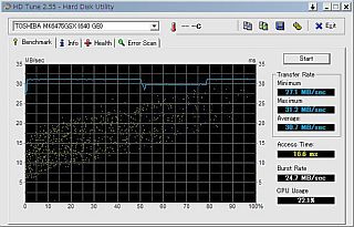 640GBの「データ転送速度」がディスクの内周も外周も変わらず、“かなり遅い!”しかも、“遅いまま!(27〜31MB/sec、平均30MB/sec)”と出た...はぁ?(左図)