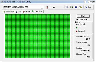 次に疑ったのは、“ヘッドの劣化”で“読み書き感度が低下”していて、「データ転送速度」が落ちているのかな?と思って、“エラー・スキャン”をしてみた。(左図&<クリック>)