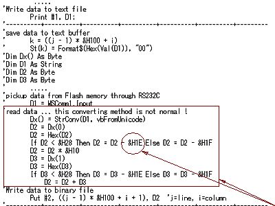 A program ( FlashReader.exe ) created using " VB6 ( Visual Basic 6.0 ) can "read" from the Flash memory "28F002BX-T", and "write" and "block erase" to it can be done by manual . It has become. (Fig.2 [click])