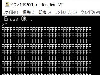 For the time being, the one-character command is as follows. l (A0-A7 data to PORTB), m (A8-A15 data to PORTD), h (A16-A17 data to PORTE) d (D0 to D7 data to PORTA), r (read data from PORTA), w (Write data to PORTA) e (Erase a block), p (Program to PORTA at Vpp on)