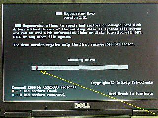 「HDD Regenerator」のこの無料バージョンは、一度不良セクタが出ると、その後は一旦クリアされるのだが、それが出なければ、ハイライト・バーがずっと続くわけだ。(左写真<クリック>)