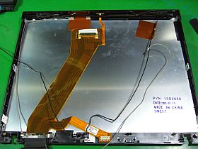 LCDの入替えは、それほど難しくないはずと多寡を括って居たのですが、筐体内やLCD周りの無線LANのアンテナ・ケーブルが邪魔で、結構ややこしそう。(左写真&<クリック>)