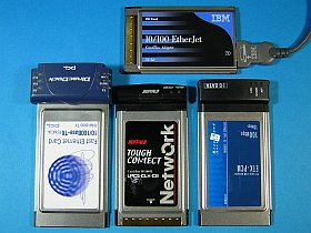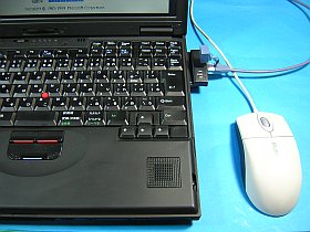 それで、まず「IBM 10/100 EtherJet」でやってみたら、速度はまあまあの感じですが、運用面ではケーブルとカップラ部がかなり邪魔! 机の後ろで引っ掛かったりして、危うくカードがダメになりそうだったので、マウス・コネクタの所にくくり付けたりして難を回避。(<クリック>で、その様子)