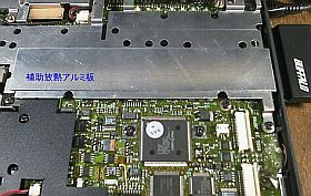 でも、あまり大袈裟な放熱器も付けられないので、アルミ板の切れ端をCPUの上(キーボードの下)に挟んで、CPUの頭との接触を良くするだけにしました。