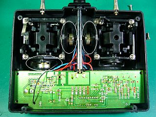 中の機構を改造して、「スロットル」側に付いていたVR(可変抵抗器)を、反対側に移して「エルロン」として使えるようにした。(左写真)
