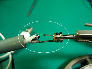 ジャンク箱から掘り出した(マウスか何かから切り取った)ケーブル(約60cm)を使ったが、その途中から被覆を剥いで、中の芯線(緑か白のどちらを使うか迷ったが、今回は緑線)を使用。