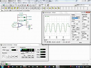 で、考えた回路を描いて、「仮想ジェネレータ」から信号を出して、その出力波形を「仮想オッシロスコープ」でみた。(図3)