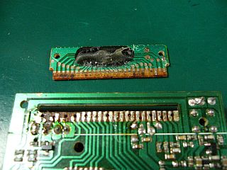 「マイコン基板」側の端子の出具合を確かめて(図7)から、それらの端子群に「予備半田」をしておいた。