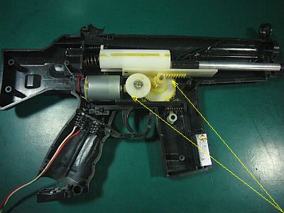 このミニ機関銃の不良化の大元の原因は、“モーターの空転”で、軸に直接嵌っているポリ製平歯車がゆるゆる(?)になっていた為らしい。(図3)