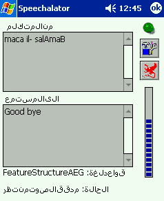 The user interface is simple, but still requires the users to know something about the operation of the machine. There is a push-to-talk button, and the recognized utterance is displayed the upper window. The second window then displays the translation as it is spoken. The utterance may be repeated at the press of a button. The input language may be change pressing another button. The display uses the native character script for the language that is to be recognized.