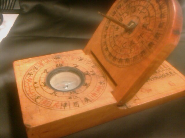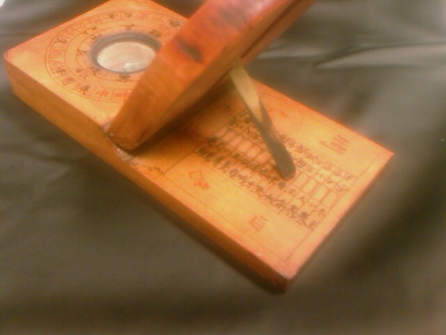 I had seen these before in flea markets in Japan but they had been far too expensive, but this one I managed to buy for USD20. I doubt it is actually an antique and could easily be made for tourists, but it looks somewhat authentic and certainly plays the role of giving the time with the sun with respect the time of year. One interesting thing to note is that the compass on it has its southern part of the needle colored red, while in the west we'd expect the northern part of the needle to be highlighted. That Chinese compasses point south, and that Western compasses point north has been put forward as a justification that magnetic compasses were discovered independently in China and the West (yes it is true the needle aligns north-south and it is only by convention that we consider them pointing north or south).