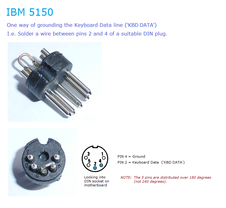 | • | The IBM 5150's POST will go into MANUFACTURING TEST mode if it finds that the motherboard's keyboard data line ('KBD DATA') is grounded. An example of how to do that is shown at here. ![]() |