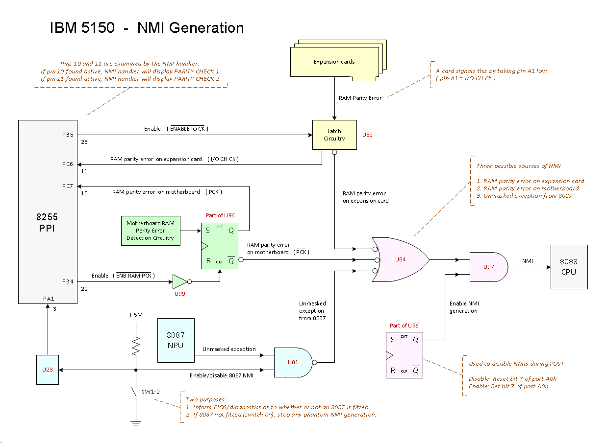 | PARITY CHECK 1 displayed on-screen | A parity error occurred when an address in motherboard RAM was read. Related diagram at here. Strickly speaking, this is not a POST error. Not only may it be seen near the very end of the POST (at the time when NMI's get enabled), it may also be seen any time later (when motherboard RAM is being read). SITUATION #1 - NEAR END OF POST A parity error occured during the POST's test of motherboard RAM. That is registered (via motherboard chip U96), but because NMI's are disabled during the RAM test (via motherboard chip U97), PARITY CHECK 1 is not seen at that time. Later, near the end of the POST, NMI's get enabled, and at that instant, an NMI is generated, and PARITY CHECK 1 then generated/seen. SITUATION #2 - LATER Seen sometime after the POST has completed, e.g. when Cassette BASIC or DOS or a DOS program/driver is running. Seen at the the time when a parity error occurs as a result of an address in motherboard RAM being read. Some possible causes: • 5150 motherboard - In an early IBM 5150, some cases of incorrect switch settings. See note 2. • 5150 motherboard - RAM chip failure. • 5150 motherboard - A RAM chip (possibly multiple) has a poor connection to the motherboard. • 5150 motherboard - bad parity generation circuitry. • 5150 motherboard - bad RAM refresh circuitry. • 5150 motherboard - bad filter capacitor/s close to the RAM chips. (Of those, suspect the tantalum type ones before the ceramic type ones.) • If intermittent, see note 1. • In an early IBM 5150, 'PARITY CHECK 1' is sometimes seen when there is not enough RAM for DOS. See here for more information. |