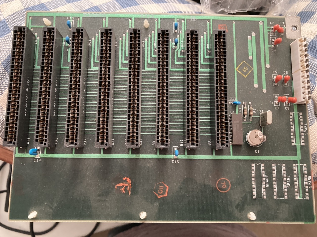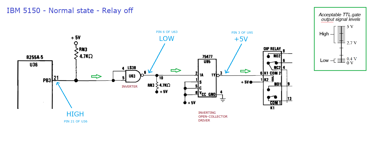| Note 3 | Assuming a faulty motherboard, a problem somewhere in the orange path shown at here. Perform the following checks in the order shown. First check: Use a multimeter to confirm that -5V is reaching pin 4 of motherboard chip U1. Next check: If pins pins 1 and 3 of the motherboard's cassette DIN connector are closed circuit (zero or low ohms) when the motherboard is unpowered, then motherboard relay K1 (cassette relay) is at fault. In which case, try lightly tapping the relay with the handle of a screwdriver. Next check: If pins pins 1 and 3 of the motherboard's cassette DIN connector are open circuit (infinite ohms) when the motherboard is unpowered, AND closed circuit (zero or low ohms) when the motherboard is powered, then a motherboard fault has relay K1 (cassette relay) turned on all the time. In which case, use the diagram at here to work out the faulty component. Next: Assuming a faulty motherboard, then because the above checks did not reveal the problem, we know that the problem cause is somewhere in the orange path shown at here, but not the relay nor the circuitry that turns the relay off and on. |