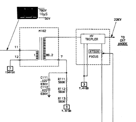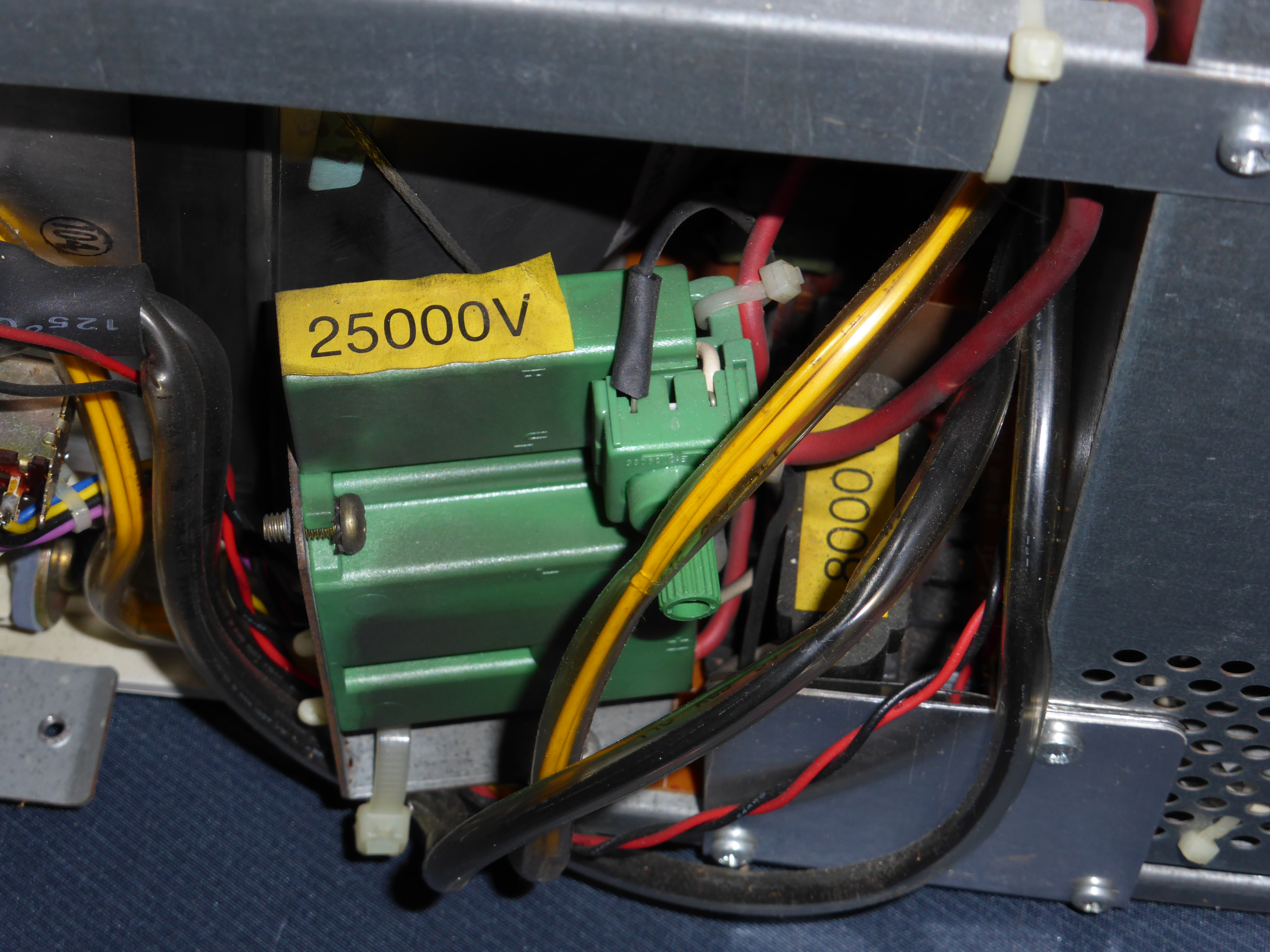 The flyback transformer in my 5154 matches that.  The photo at here shows the step-up transformer on the right (black, marked 8000V), and the tripler on the left (green, marked 25000V), interconnected by a thick red insulated wire.