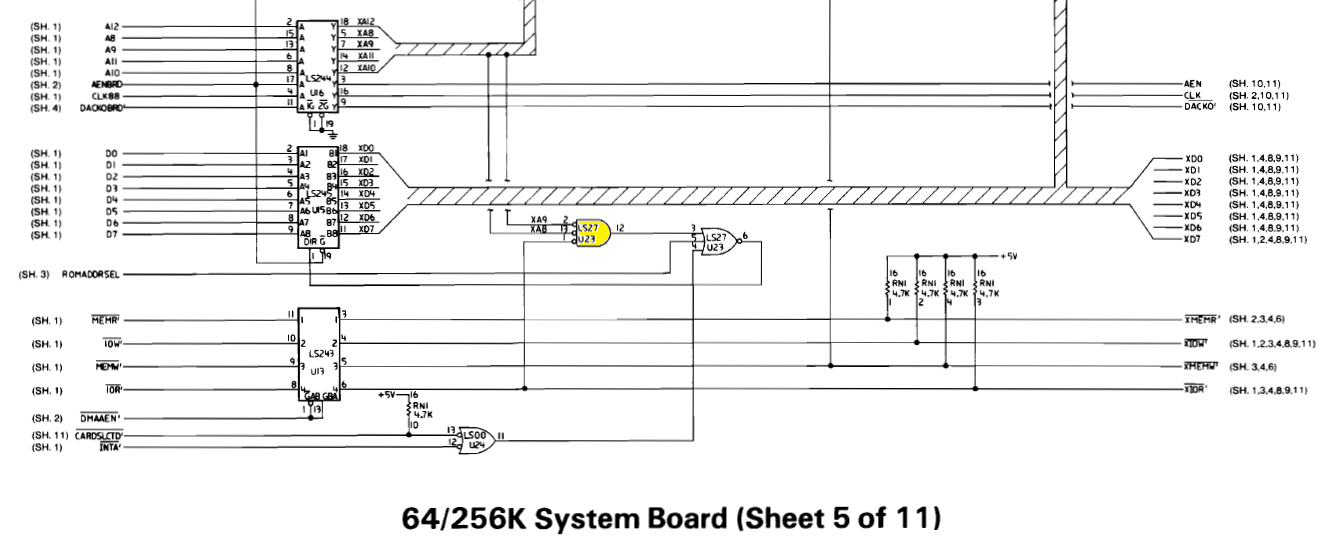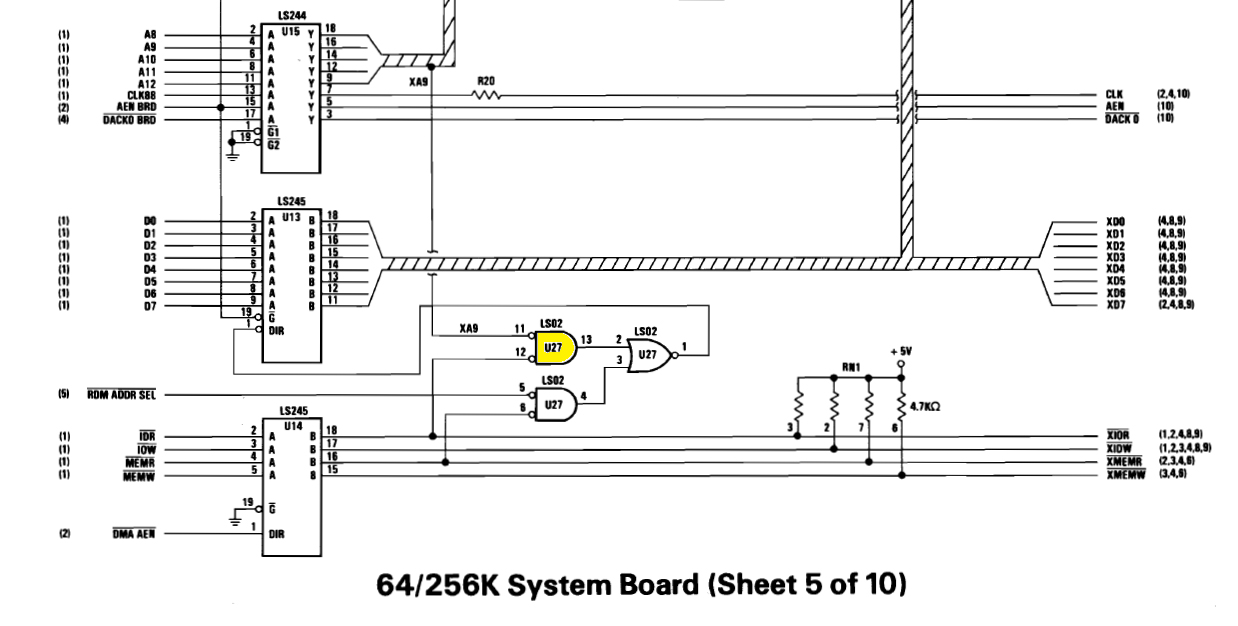 1.  Page 1-41: Read gating circuit (part of chip U27) for motherboard I/O, looks for A9 being low (0111111111 = 1FF).  See here.