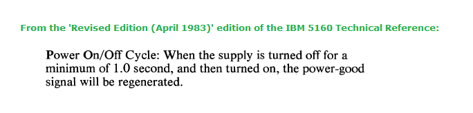 To be noted is that the 5160's IBM PSU requires a sufficient load in order to operate.  The 5160 motherboard alone is usually enough of a load.