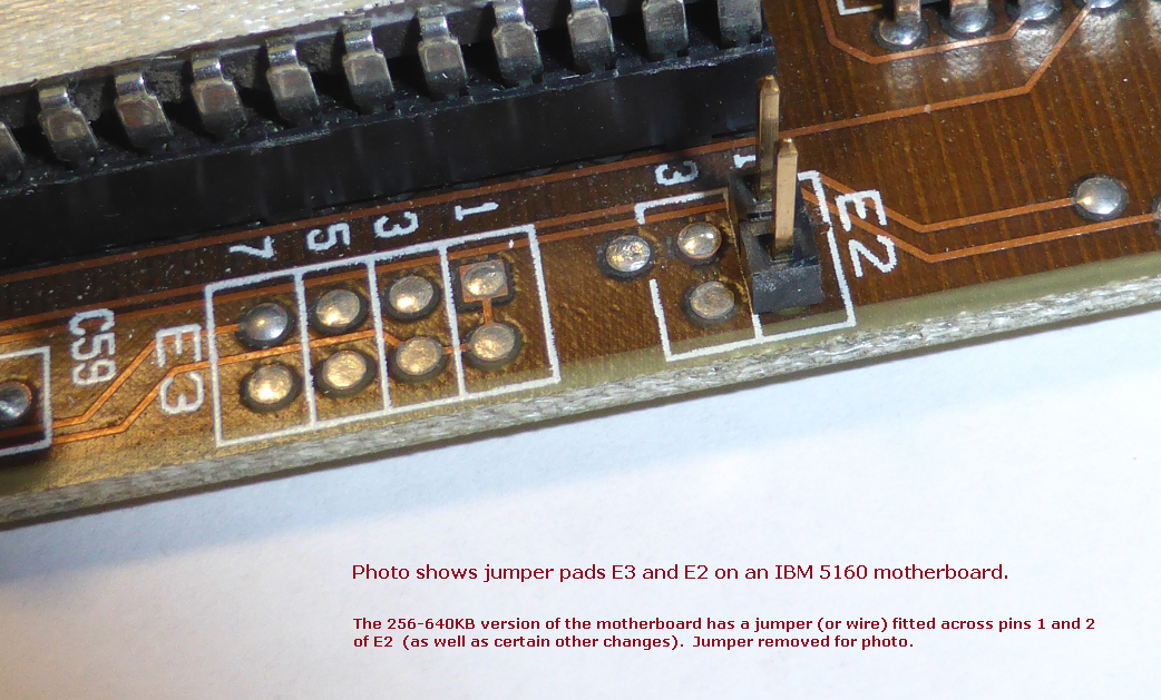 | Note 1 | An IBM supported modification is possible that allows 640K of RAM to be fitted in the RAM sockets of the 64-256KB motherboard. You will need certain parts. The procedure can be found here. Be sure to keep track of what you do, so that if things do not work out, you can undo what you have done. If you are successful, consider marking the motherboard in some way to remind yourself (and others) that the motherboard has been modified. Note that as the pointed-to procedure indicates, the jumpering of pins 1 and 2 on jumper pad E2 (photo), is the same as connecting pins 1 and 8 of U44 together via wire (photo). Both achieve the desired outcome, which is the grounding of pin 1 of U44. Your choice as which of those two methods you use. |