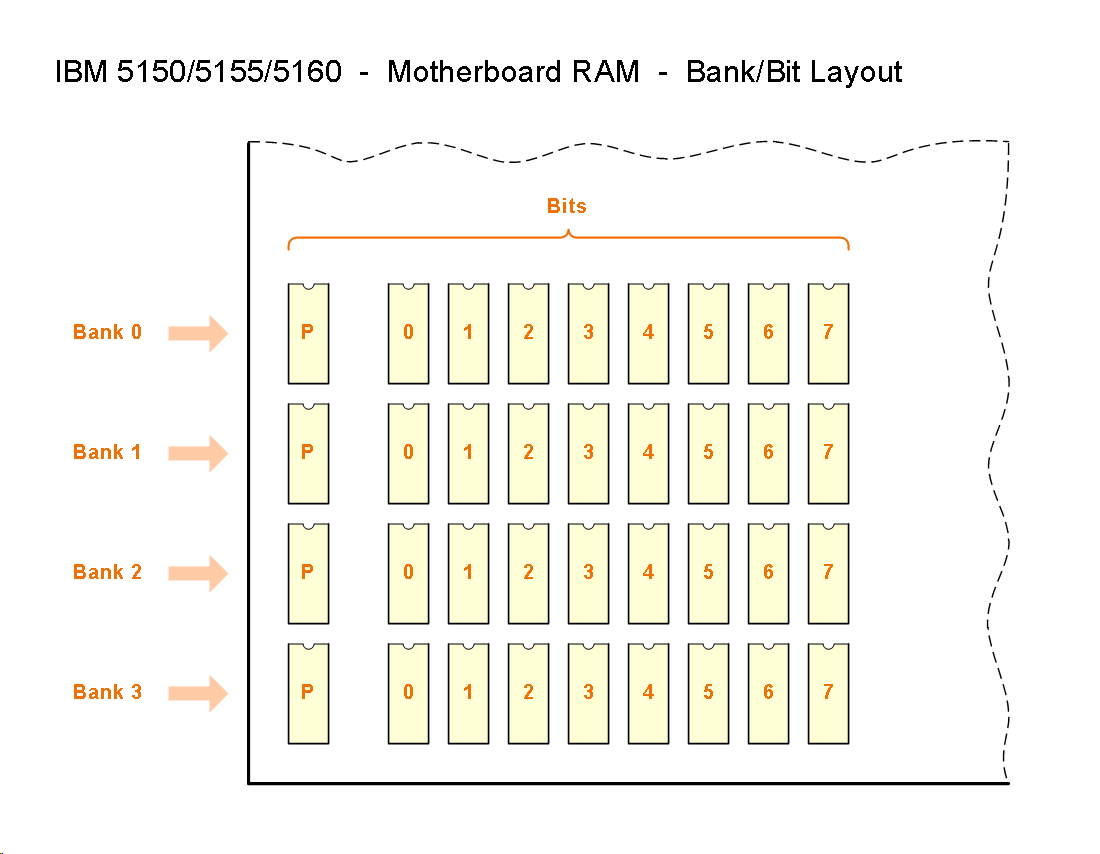 If your 5160 motherboard is the 64-256KB type, then you have the option of using RAM chips from banks 2 and 3 as well - all 4 banks use chips of the same type (generic type 4164).