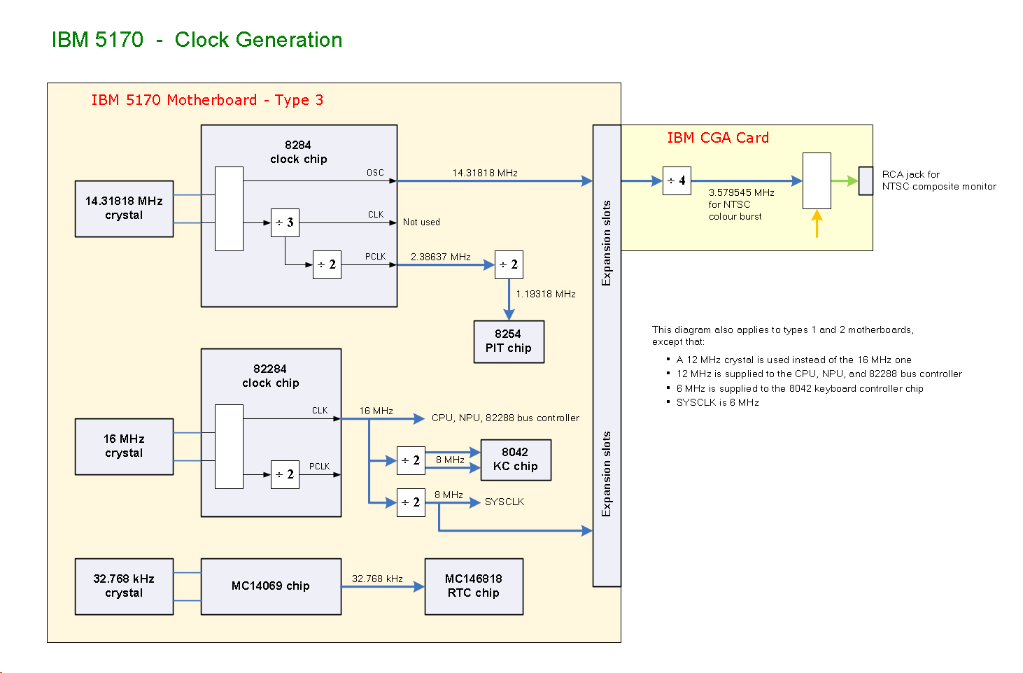 Refer to here. On the motherboard, the 82284 chip generates a 16 MHz clock signal (12 MHz for the type 1 and type 2 motherboards) for the 80286 CPU and the 82288 bus controller chip. (And optional 80287 NPU, if fitted.) |