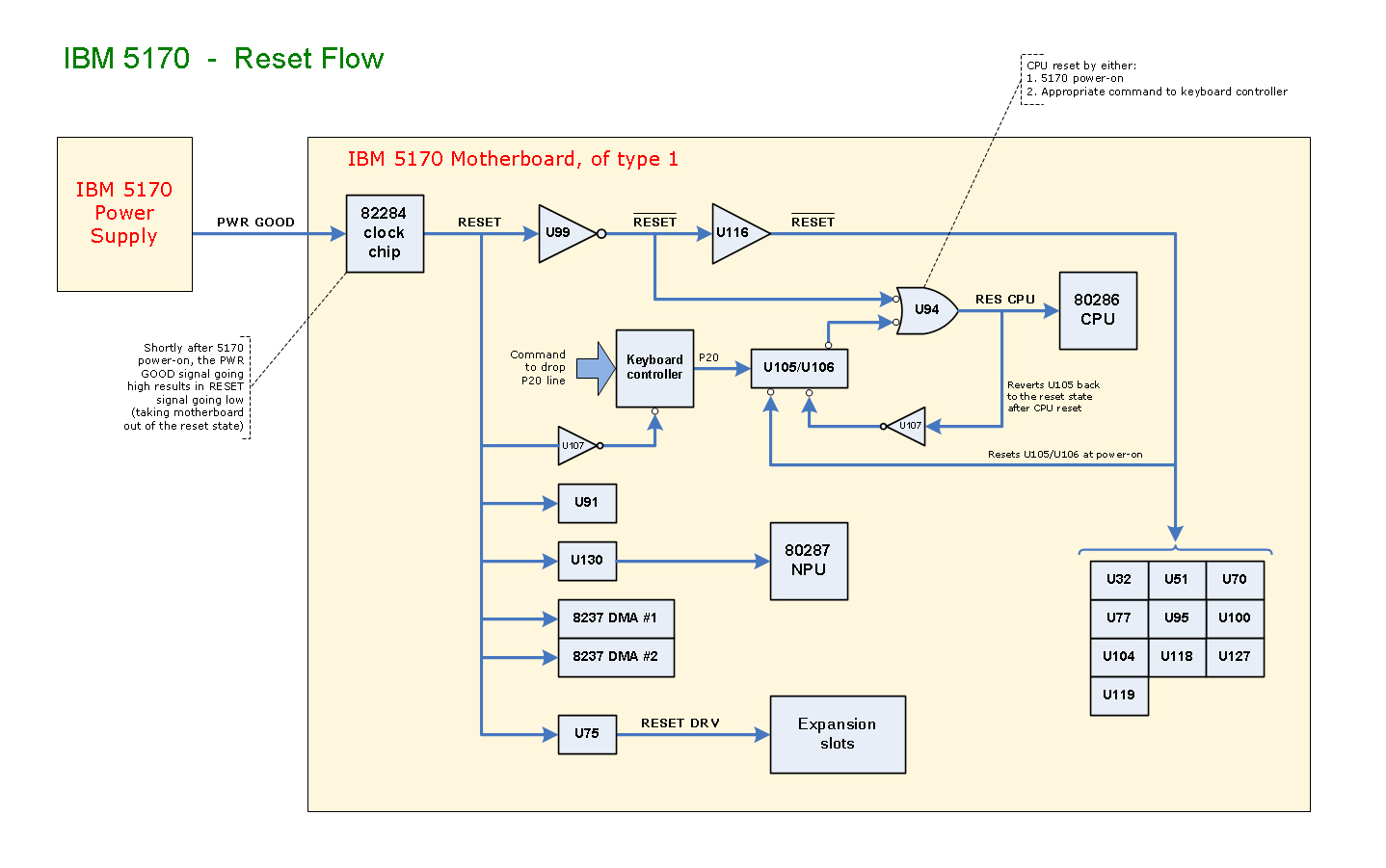 When the 82284 chip sees the power supply's POWER GOOD signal go high, it takes the motherboard's RESET line from high to low. As a result, chips are taken out of the reset state. |