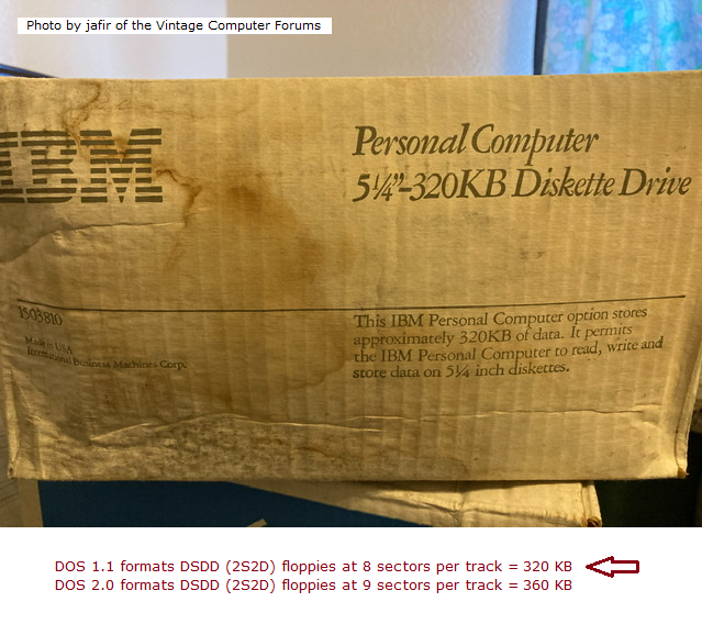 | Note 3 | • Also applies to '320K' floppies and '320K' drives. • A photo of IBM describing a floppy drive as "320KB" is at here. • A '320K' drive and a '360K' drive are the same thing. If anything, IBM should have referred to them '500KB' drives instead (i.e. the unformatted capacity). • A '320K' floppy: DOS has formatted a DSDD (2S2D) 5.25" floppy using 8 sectors per track (introduced in DOS 1.1). • A '360K' floppy: DOS has formatted a DSDD (2S2D) 5.25" floppy using 9 sectors per track (introduced in DOS 2.0). |