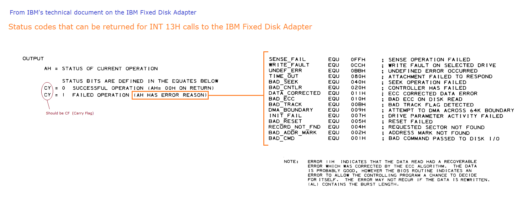 When I then removed the control cable from the IBM Fixed Disk Adapter, an error was returned, specifically the status code of AH=80 and CF=1 (AH=80 meaning 'timeout', and CF=1 meaning 'error')