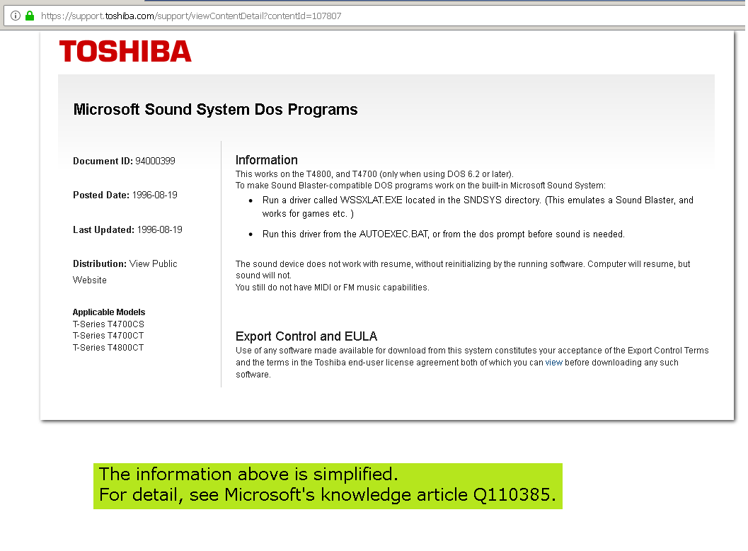 1.  Toshiba's 94000399 document     ('Sound Blaster-compatible DOS programs work on the built-in Microsoft Sound System')