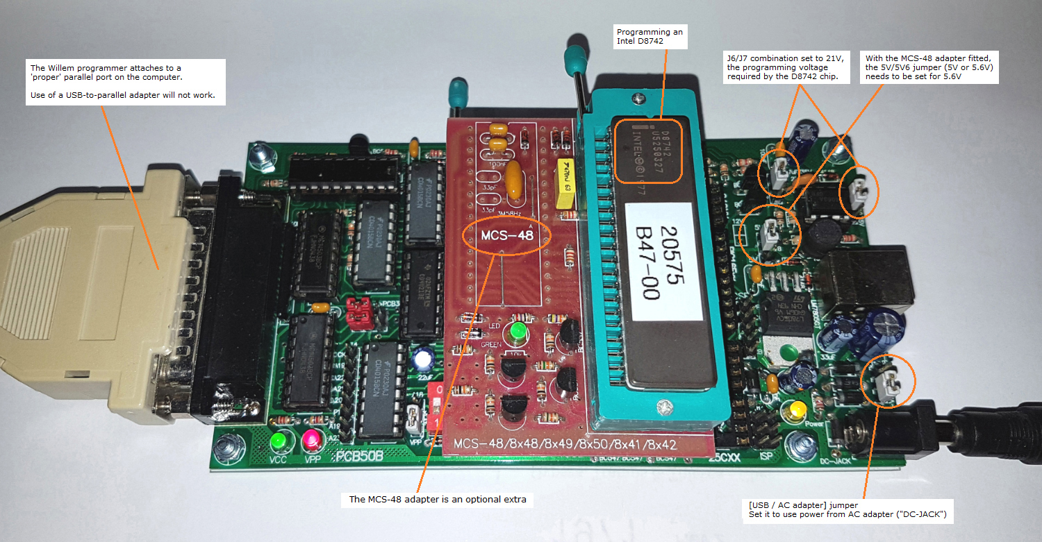 - Requires that your computer have a parallel port.  Some people have thought, "I have no parallel port, and so I will buy a USB-to-parallel adapter.", not knowning that such adapters are unsuitable - they are designed for parallel printers only.