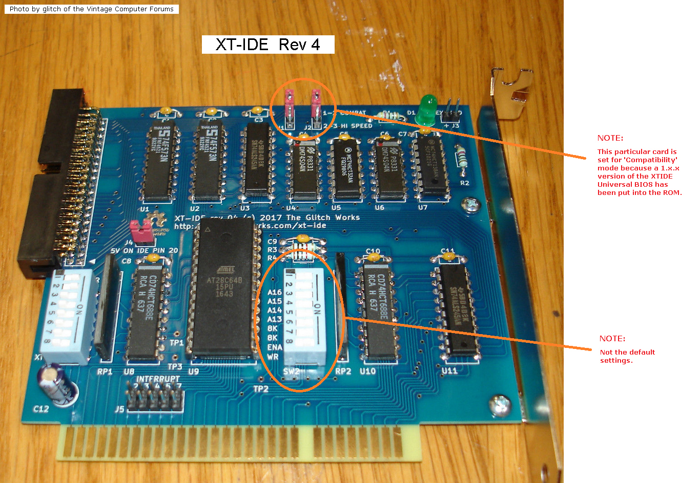 Circa 2009. Click on photo for larger view. Information at here. Configuration of adapter/controller/device type in XTIDE Universal BIOS (a.k.a. XUB): For 1.x.x versions of XUB (e.g. 1.1.5), set 'Bus type' in XUB per the photo at here. For 2.x.x versions of XUB (e.g. 2.0.0 beta 3+) , set the 'Device type' to 'XTIDE rev 1' |