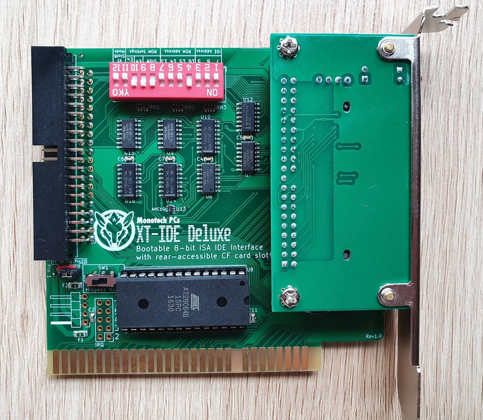 Circa 2020. Click on photo for larger view. "Rev1.0" appears on back of the card. Monotech's advertising web page at here. Design information at here. Does not require a CF card that works in 8-bit mode. Configuration of adapter/controller/device type in XTIDE Universal BIOS (a.k.a. XUB): If SW1 is OFF, i.e. hi-speed mode is OFF, set the 'Device type' in XUB version 2.0.0 beta 3+ to 'XT-IDE rev 1' If SW1 is ON, i.e. hi-speed mode is ON, set the 'Device type' in XUB version 2.0.0 beta 3+ to 'XT-IDE rev 2 or modded rev 1' |